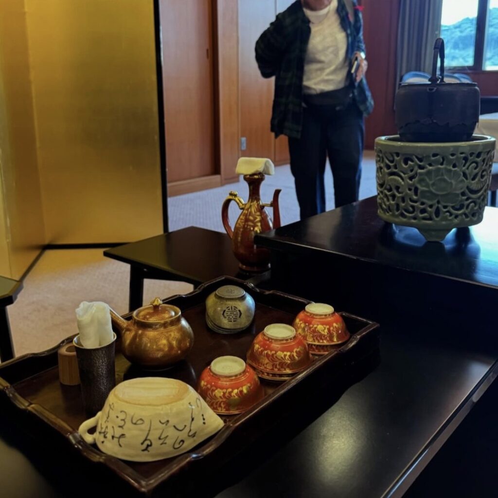 今日のために選ばれた茶器や掛け軸、茶花が並ぶ空間。