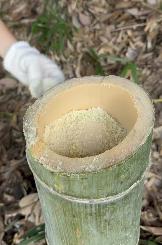 竹を切り、二つに割り、節をとる。