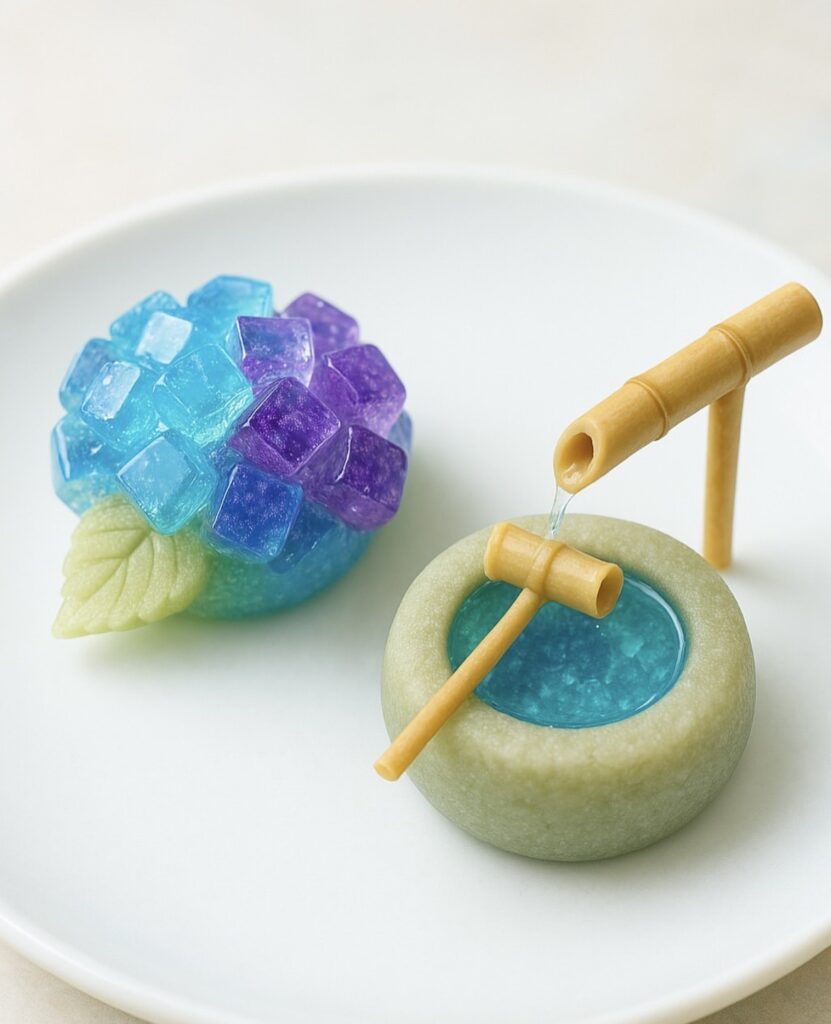 みずみずしいアジサイとつくばいで表現します。