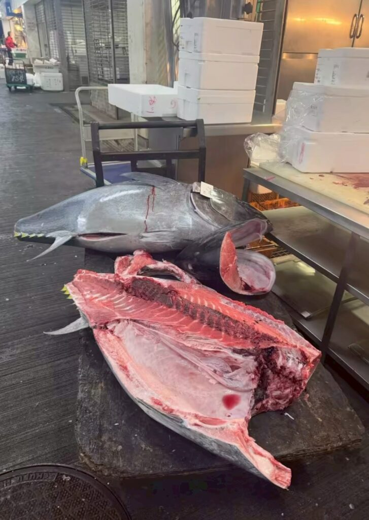 立派なマグロが注文ごとに切り分けられていく様子。