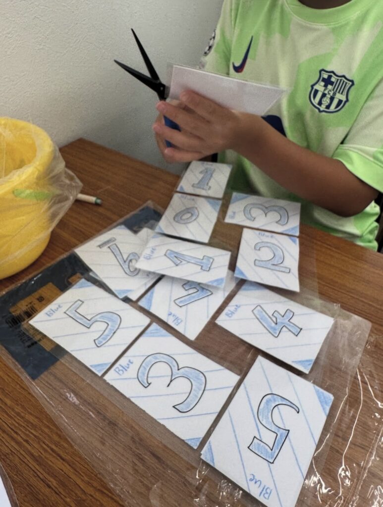 紙を切り、数字を書き、色を付けてラミネート…。